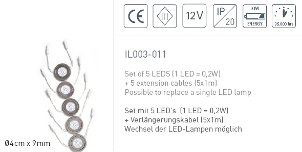 Набор содержит 5 ламп с чрезвычайно низким энергопотреблением (0,2W) и гарантированнім временем работы 35000 час. |